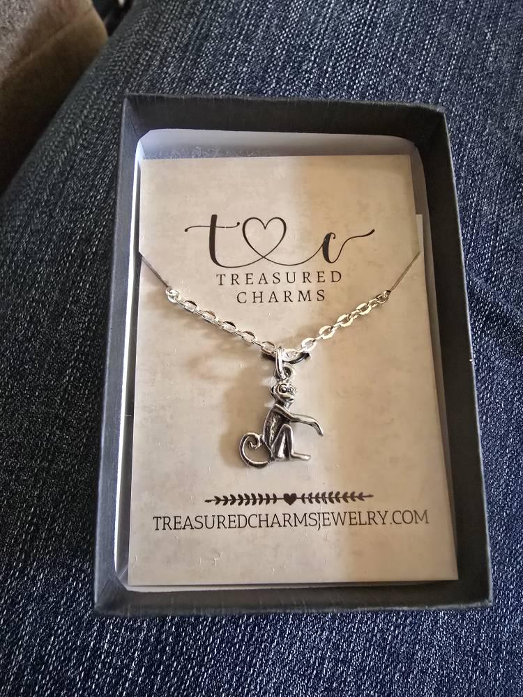 This Monkey Charm necklace comes on a silver-plated chain that is available in different lengths. Please choose your desired length from the drop-down menu when placing the item in your shopping cart.