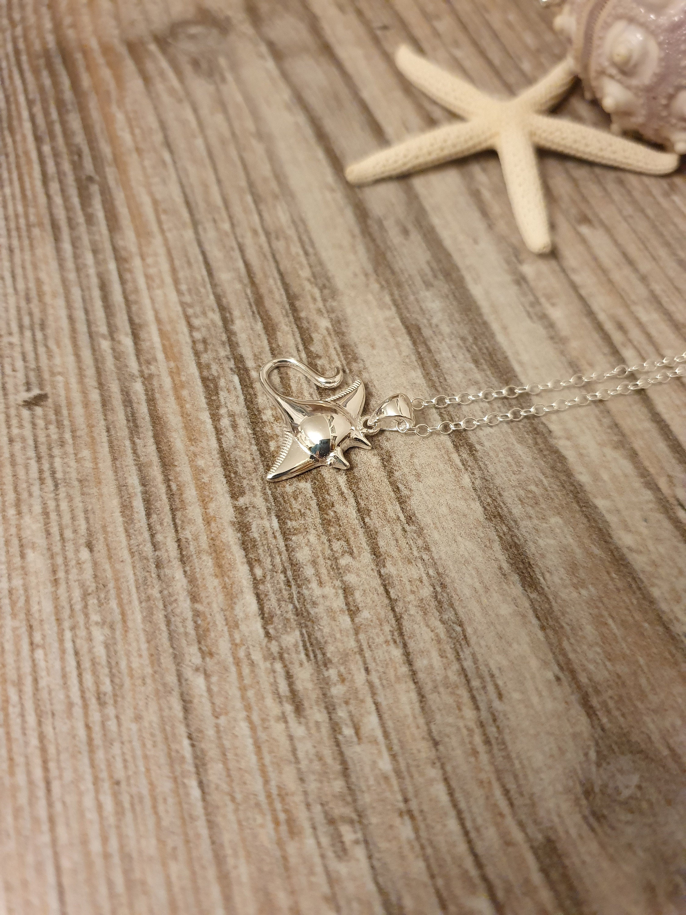 This Stingray necklace comes on a sterling silver chain that is available in different lengths. Please choose your desired length from the drop-down menu when placing the item in your shopping cart.