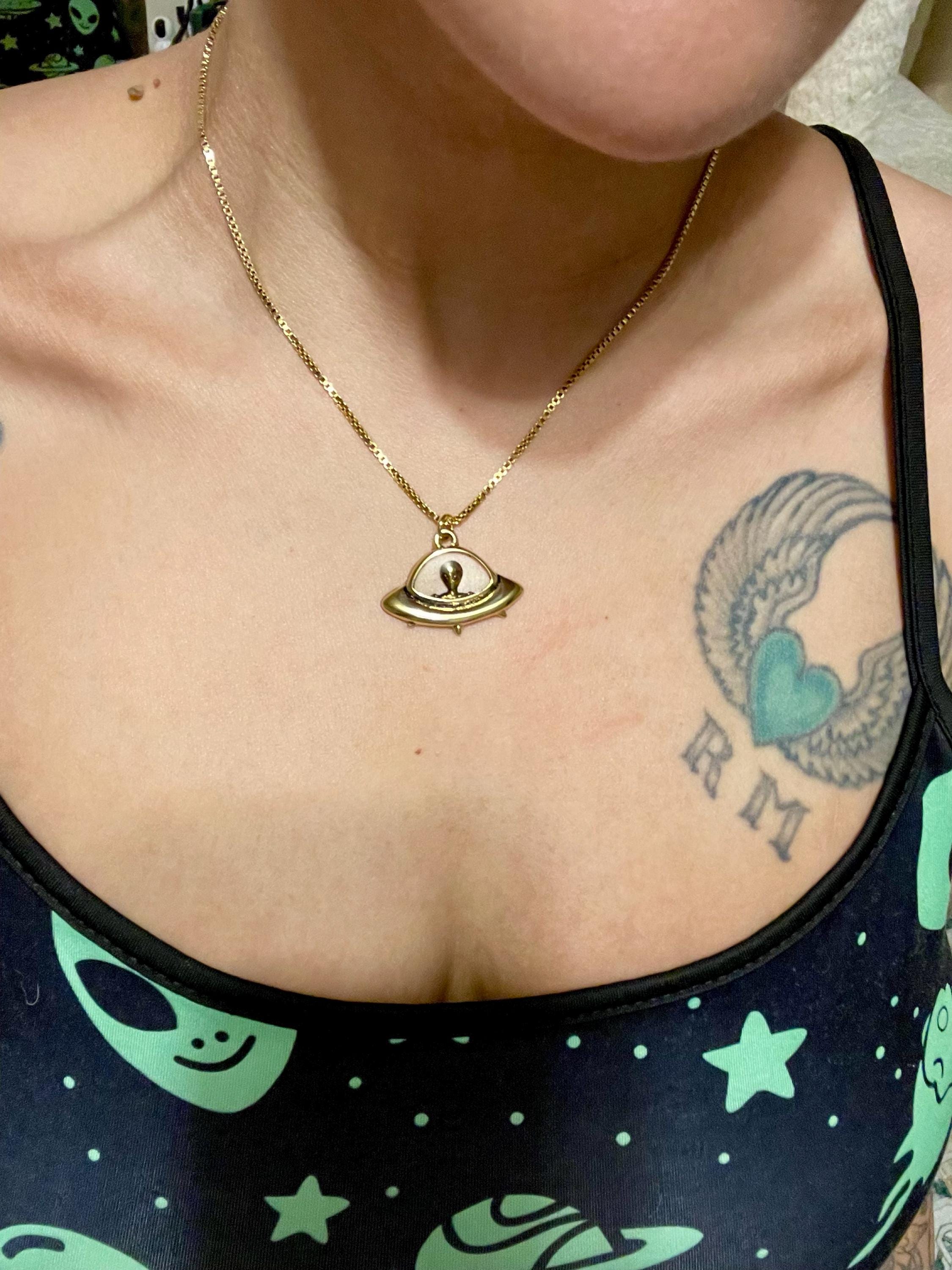 Absolutely LOVE this charm! I put it on a chain I already had, and it looks so cute! My favorite thing about it is the “dome” of the ship itself is actually clear, which I’m assuming it’s resin. That little detail sets it off for me. I will be wearing it a lot (I have a thing for alien stuff!) 👽💚 Thank you!